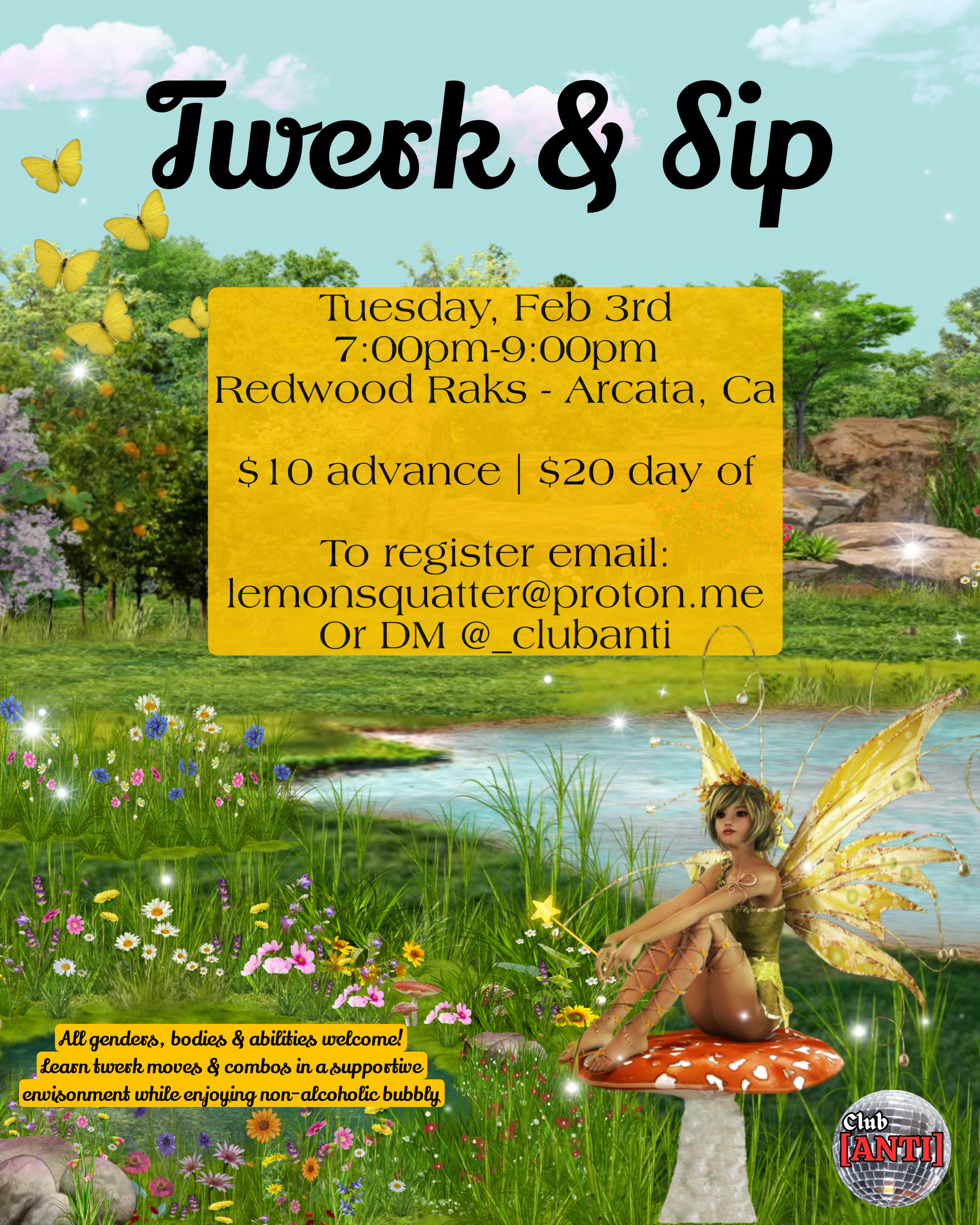 Learn twerk moves and combos in a supportive environment while enjoying non-alcoholic bubbly. All genders, bodies, and levels are welcome.