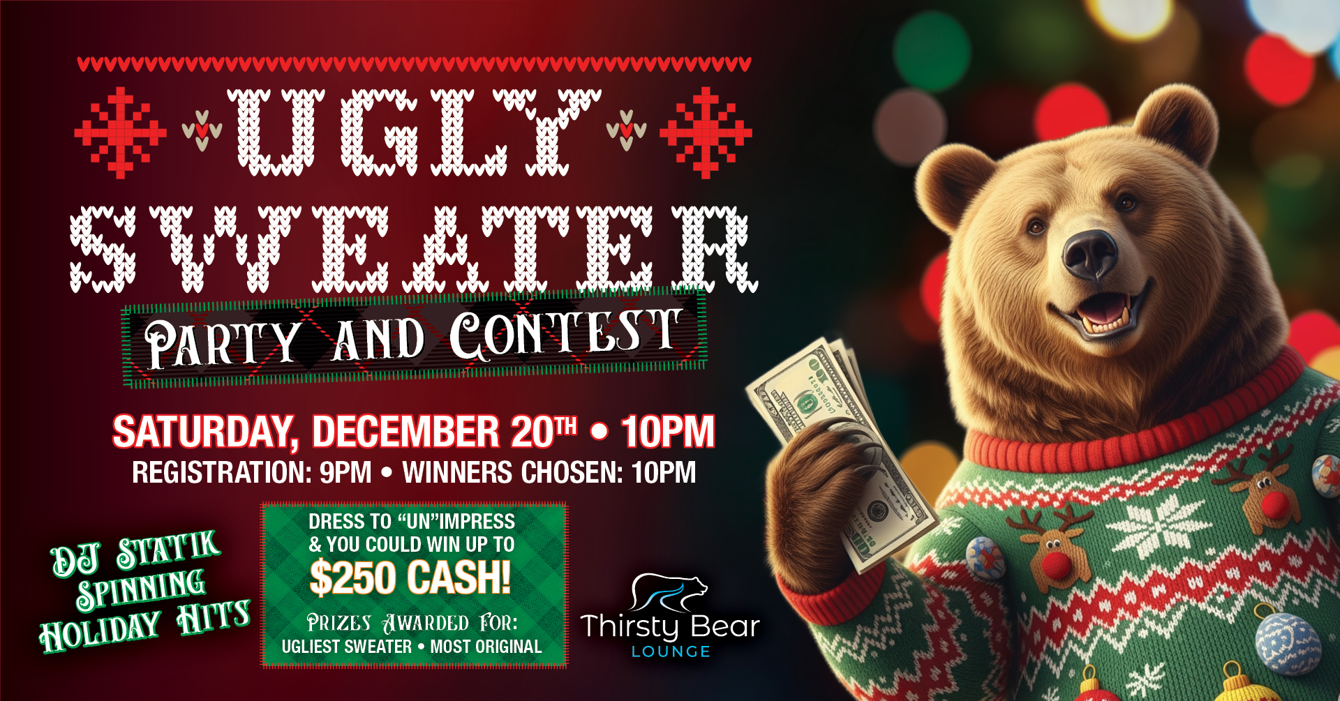 Saturday, December 20th, show off your wildest, wackiest, ugliest holiday sweater for a chance to win up to $250 cash! Join us in the Thirsty Bear Lounge for a night of festive fun as DJ Statik spins all your favorite holiday hits.