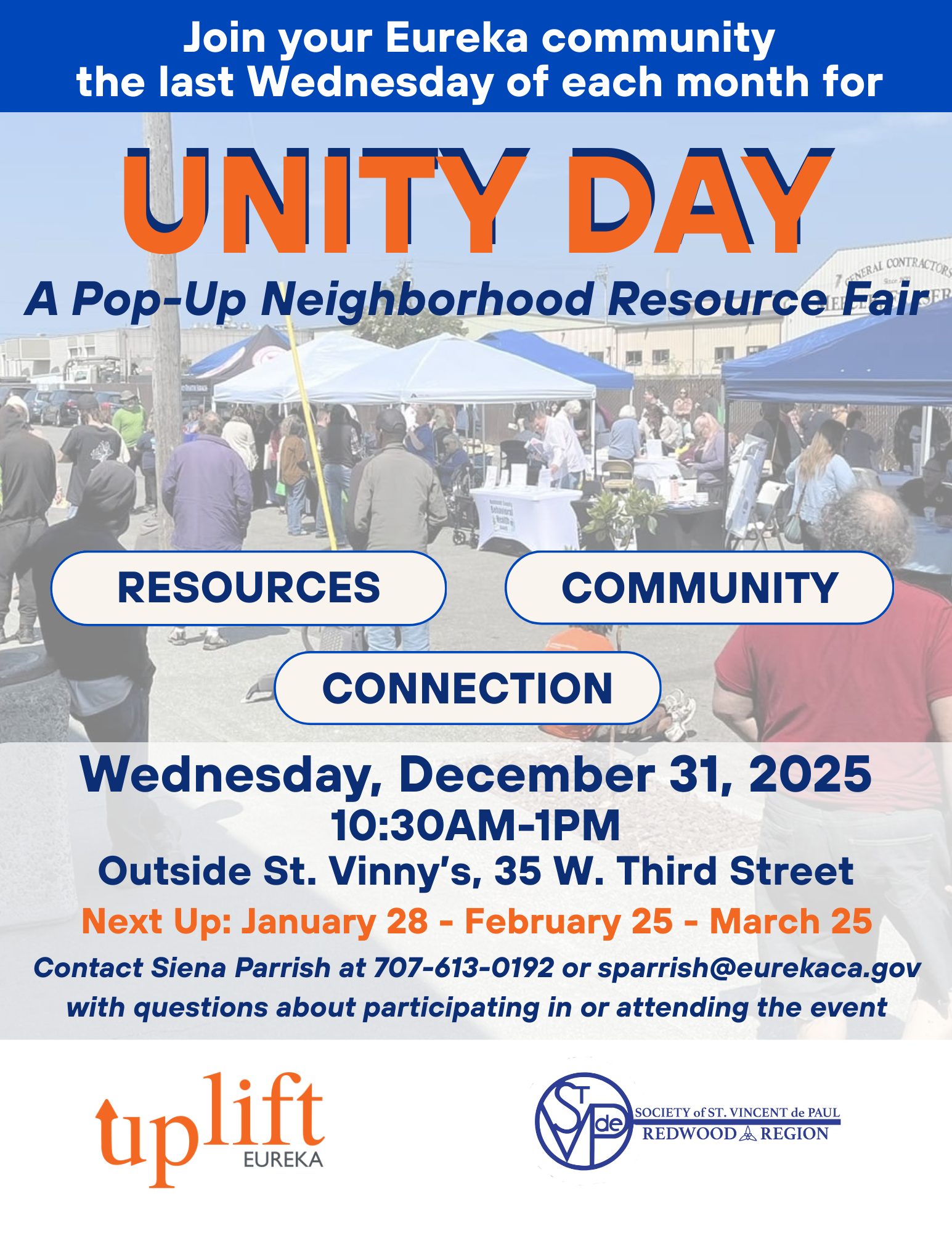 Join Uplift Eureka and other local service providers for our 4th Unity Day at St. Vincent de Paul on Wednesday, December 31st from 10:30AM-1:00PM in Eureka!
