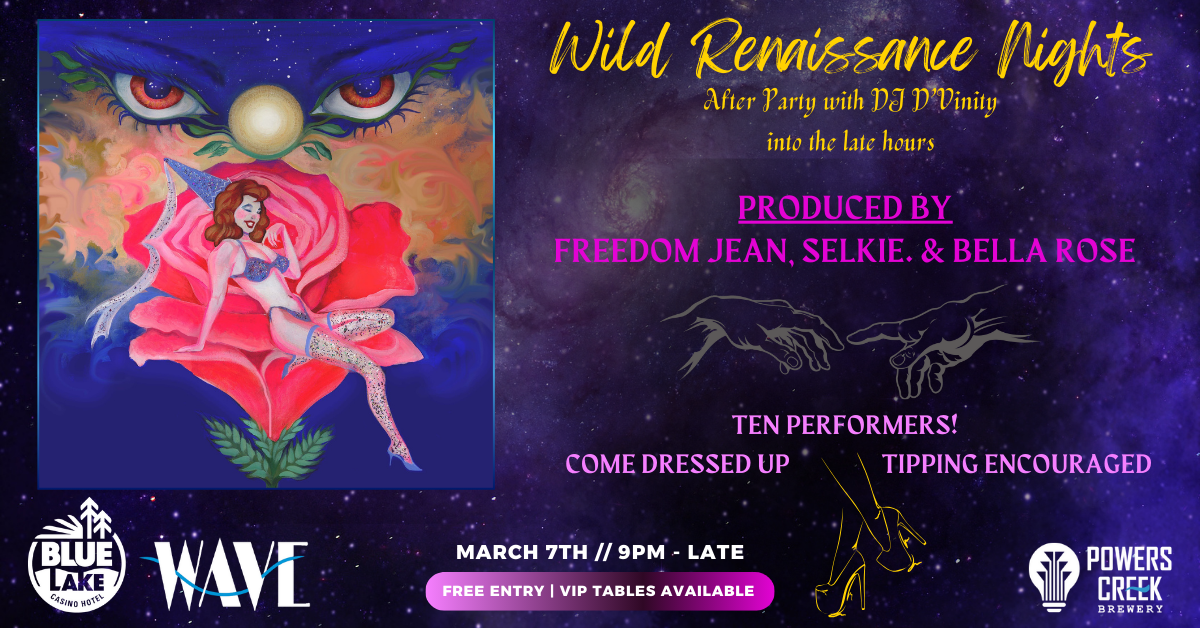 Prepare to leave inspired and delighted. We are elated to collaborate with Blue Lake Casino Hotel again to bring you a FREE show! However, if you want to get close to the action, VIP tables are available for purchase, and tipping is greatly encouraged.
