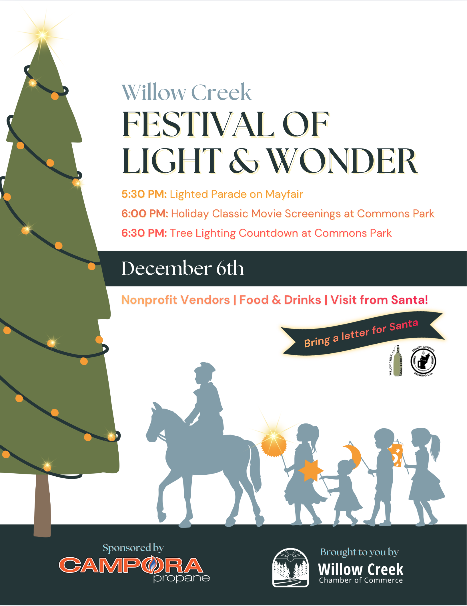 Join us for an evening filled with sparkle, community and holiday cheer at Willow Creek’s annual Festival of Light & Wonder!