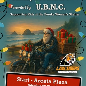 We meet at the Arcata Plaza with kickstand up at noon, and we ride to the Eureka Vet’s hall where we deliver the new, unwrapped toys.